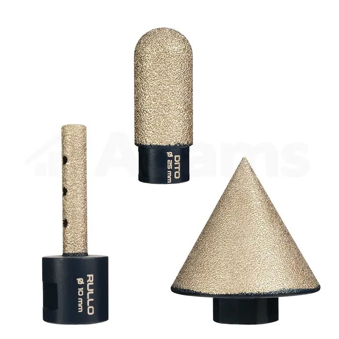 Formfräser dienen zum Profilieren, Aufbohren, Fräsen und Gravieren in verschiedenen Formen. Sie sind für den Einsatz mit Winkelschleifern und anderen Geräten mit hoher Drehzahl geeignet. Sie erweitern effektiv Löcher in harter Keramik, bohren Feinsteinzeug auf und schleifen Marmor. Die Kegelfräser von CONO veredeln präzise die Kanten der Löcher, und die feinen Diamantpartikel sorgen für eine hohe Bearbeitungsqualität, die sich ideal für das Schleifen von empfindlichen glasierten Schichten eignet.