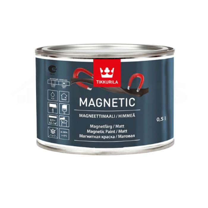 Farba magnetyczna TIKKURILA MAGNETIC to wodorozcieńczalna farba o właściwościach magnetycznych która nadaje się do malowania powierzchni betonowych, szpachlowanych, płyt gipsowych i wiórowych. W celu uzyskania dowolnego koloru, farbę Tikkurila Magnetic można pomalować farbami do ścian Tikkurila jedno – lub dwukrotnie.